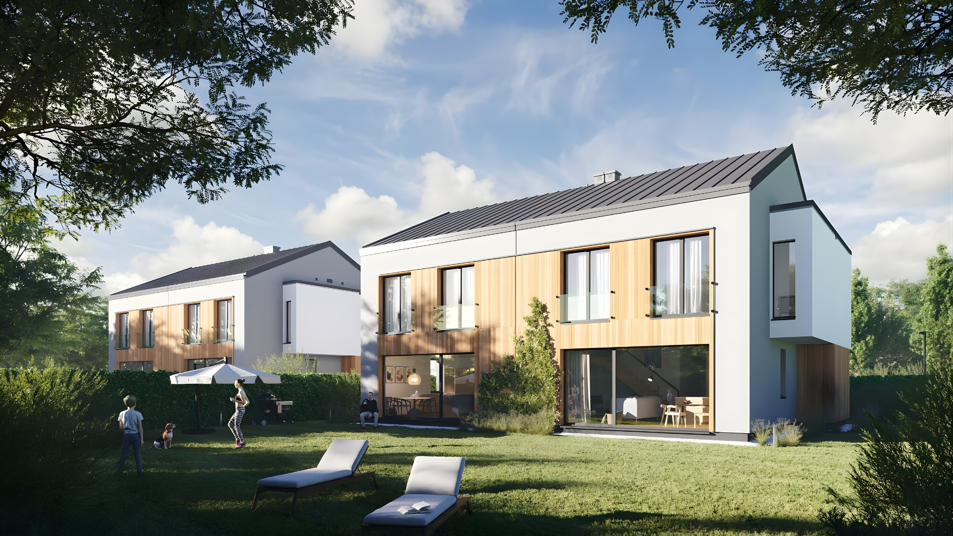 Bliźniaki w spokojnej okolicy pod Warszawą — połączenie komfortu, stylu i natury.